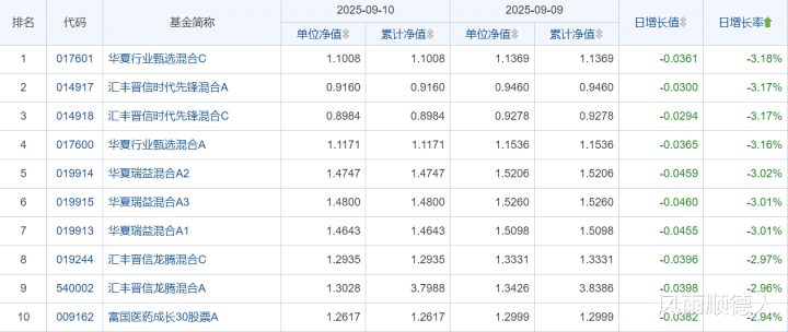 2025年9月10日开放式基金净值增长排名后10