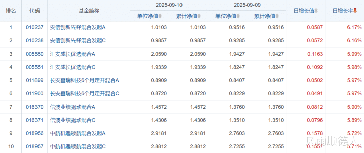 10日开放式基金净值增长排名前10的基金分别是:安信创新先锋混合发起A、安信创新先锋混合发起C、汇安成长优选混合A、汇安成长优选混合C、长安鑫瑞科技6个月定开混合A、长安鑫瑞科技6个月定开混合C、信澳业绩驱动混合A、信澳业绩驱动混合C、中航机遇领航混合发起A、中航机遇领航混合发起C。